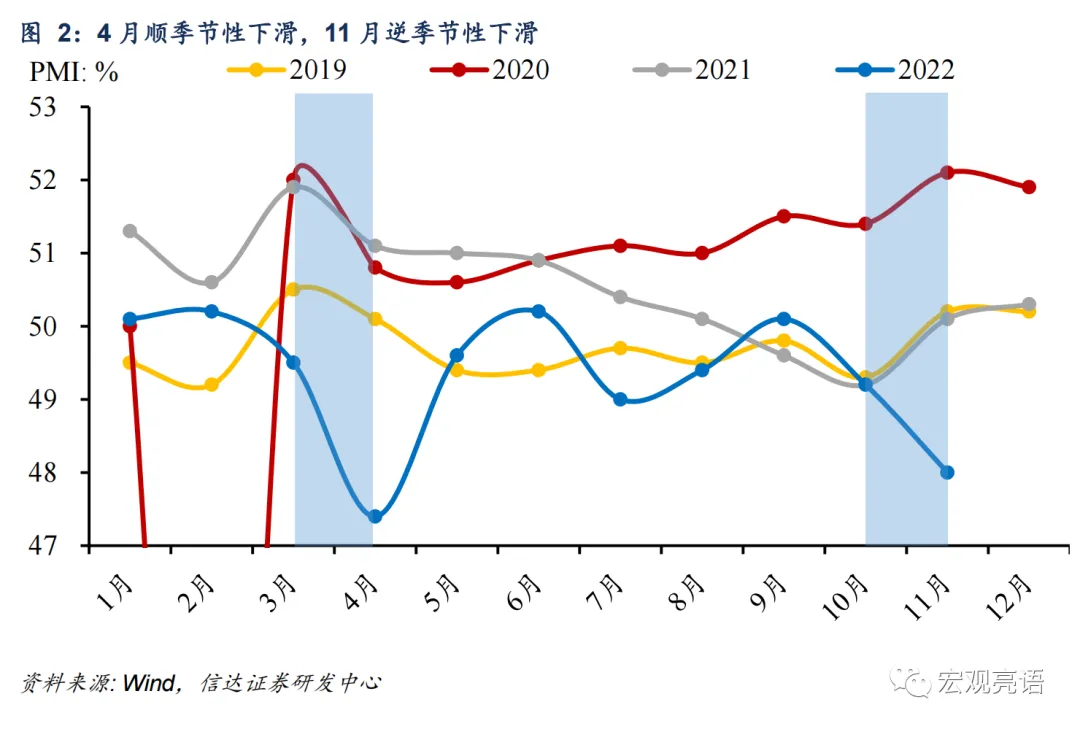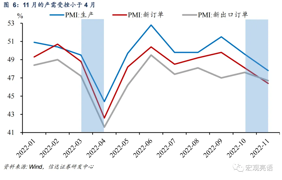 2)从制造业冲击上看,制造业景气度所受冲击小于4月。受疫情多发影响,11月PMI逆季节性下降,由10月的49.2%下滑至48.0%,减少了1.2pct。再看同受疫情扰动的4月PMI,由3月的49.5%下滑至47.4%,减少了2.1pct。整体来看,11月受到的冲击程度比4月要小。