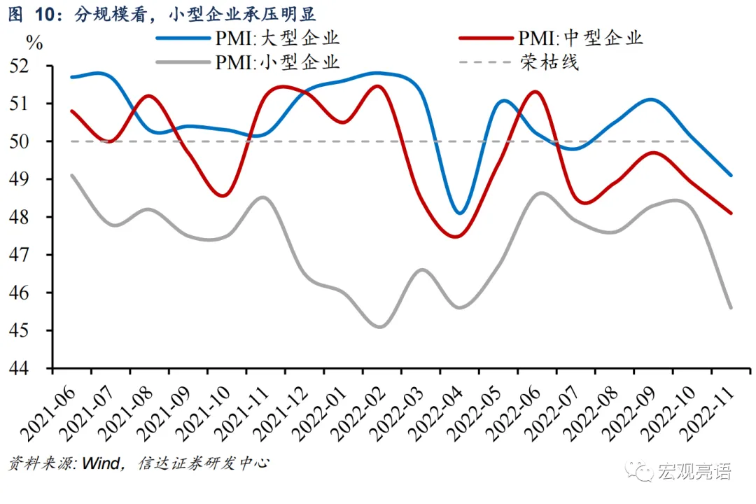 疫情更严峻,冲击力却减弱,11月制造业PMI变动与 4月的差距在于生产、新订单和配送时间贡献不同。1)生产和需求端受到的冲击程度不同。同受疫情影响,4月PMI和11月一样呈现产需双弱的格局。但对比来看,4月的制造业景气度,无论是生产端还是需求端,都比11月更加疲弱。4月产业链、供应链运行受阻,人员上岗困难,大宗商品价格上涨,制造业的供给冲击、需求收缩压力加大,11月的生产和需求也偏弱。二者冲击不同的根源或在于国内疫情严格指数不同,因此对景气度的扰动有所削弱。 2)物流不畅导致交付时间滞后不同,库存积累程度也不一样。11月供应商配送时间指数下滑,主要是疫情爆发拖累了整体制造业的交付时间,但4月受此拖累更加明显。国内市场需求不足,再加上供应商交货时间有所滞后,企业库存被动积累,11月的产成品库存指数上升。原材料库存指数下滑也显示出企业的市场信心受挫,备料生产的意愿下降。此外,从经济动能(新订单-产成品库存)来看,4月和11月的经济动能也有着明显差异。4月经济动能下滑到-7.7%,而11月的经济动能仅下滑到-1.7%。同时,11月制造业企业的资金压力上升,短期内市场预期的波动也比较大。一方面,企业利润空间收缩,整体资金压力加大。11月制造业的出厂价格指数为47.4%,比10月下降了1.3个百分点,购进价格指数为50.7%,较10月下降了2.6个百分点。原材料购进价格扩张且出厂价格收缩,反映出企业的利润空间继续压缩。根据中国物流和采购联合会,11月疫情期间企业销售偏紧,资金紧张的企业比重较10月增加0.9 pct,整体资金压力上升。分行业来看,两个价格指数回落幅度较大的是以生产基础性原材料为主的行业,如:石油煤炭及其他燃料加工、化学纤维及橡胶塑料制品、黑色金属冶炼及压延加工等。分规模来看,大中小型企业景气度继续回落,但小企业承压更大。受到疫情多地散发的影响,不同规模企业的景气度都在收缩区间继续回落。大、中、小型企业PMI分别为49.1%、48.1%和45.6%,比上月下降1.0、0.8和2.6个百分点,均低于临界点,但相比之下小企业的压力明显更大。此外,从资金紧张和市场需求不足情况来看,大、中、小型企业的占比均有所上升,而小型企业资金紧张和市场需求不足的占比分别为46.0%和58.8%,比上月上升0.8和1.9个百分点,小型企业生产经营压力加大。另一方面,短期内制造业的市场预期波动加大。由于当前疫情形势比较严峻,短期内企业的生产经营活动预期趋于减弱,11月生产经营活动预期指数为48.9%,是从2020年3月以来首次降至50%以下。从行业看,纺织、化学原料及化学制品、黑色金属冶炼及压延加工、金属制品等行业生产经营活动预期指数均低于43.0%,体现出这些行业的企业信心不足。但是农副食品加工、食品及酒饮料精制茶、医药、电气机械器材等行业的生产经营活动预期指数继续位于景气区间,市场需求保持增长,这些企业对行业发展较为乐观。11月非制造业PMI为46.7%,较10月下降2个百分点,连续5个月环比下降,已经是第二个月处于收缩区间。11月在疫情波及面逐步扩大的影响下,非制造业供需下行压力进一步加大,非制造业PMI年内仅高于4月份。疫情扰动犹存,服务业继续探底。随着疫情波及面的扩大,11月服务业PMI继续下行至45.1%,较上月下降1.9个百分点,下降幅度不及4月的6.7个百分点。从高频数据看,受疫情反弹影响,11月北京、广州地铁客运量下跌,导致道路运输、航空运输、住宿、餐饮、文化体育娱乐等接触性聚集性行业商务活动指数低于38.0%,行业业务总量出现回落。基础建设相关活动继续支撑建筑业的高景气水平。四季度以来,新一批重点项目集中开工,在稳投资相关政策支持下,以土木工程建筑为主的基建相关行业保持较快增长。从高频数据来看,受疫情和天气影响,11月石油沥青装置开工率和全国水泥发运率有小幅下降。但在稳投资相关政策的支持下,基础建设相关活动继续支撑建筑业,石油沥青装置开工率和全国水泥发运率处于年内较高水平,建筑业PMI维持较高景气水平。此外,非制造业也存在一些结构性亮点。一是受益于电商购物节的需求拉动,线上消费相关行业保持活跃。具体来看,11月邮政业和快递业商务活动指数较上月有所上升,且保持在较高水平。二是金融业对实体经济支持力度较好。11月金融业商务活动指数较上月有所上升,且保持在较高水平,也显示金融业活动保持稳健。