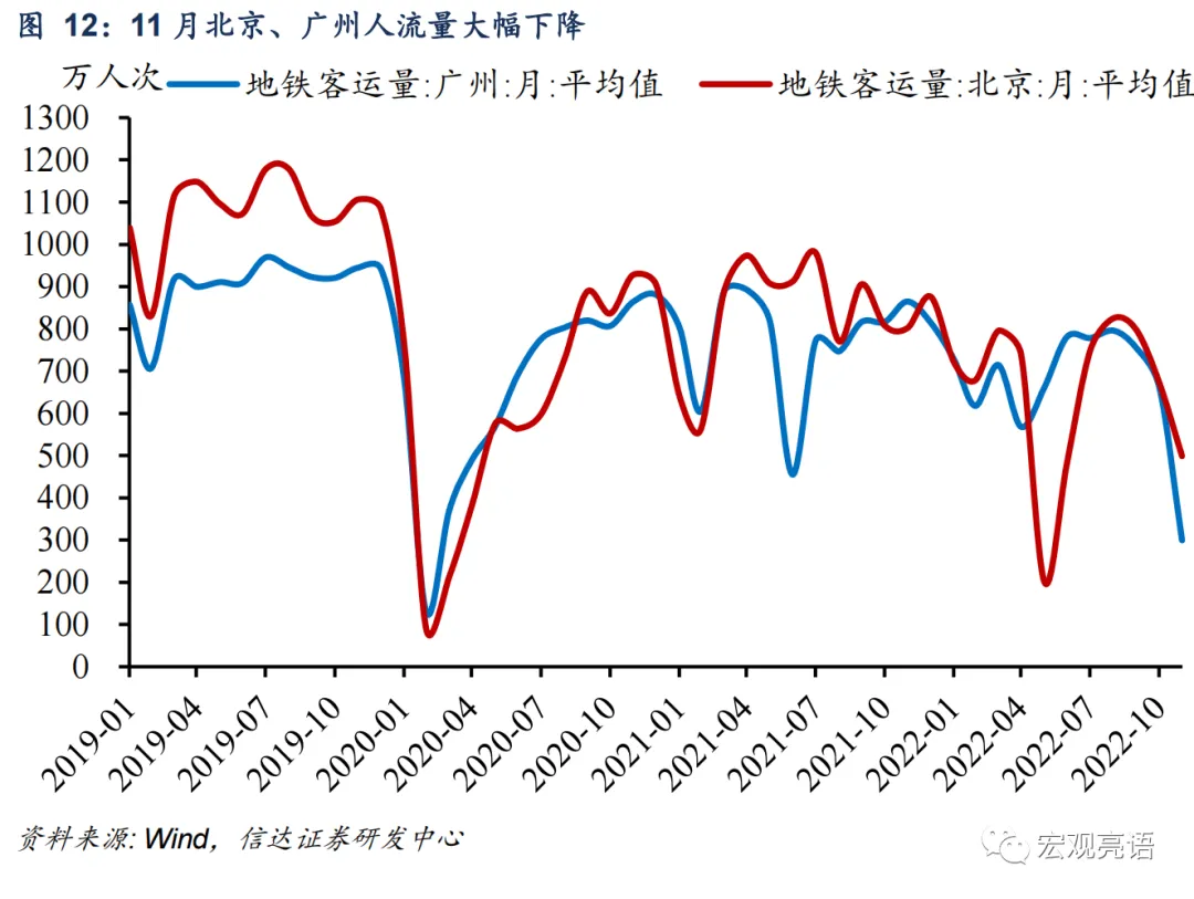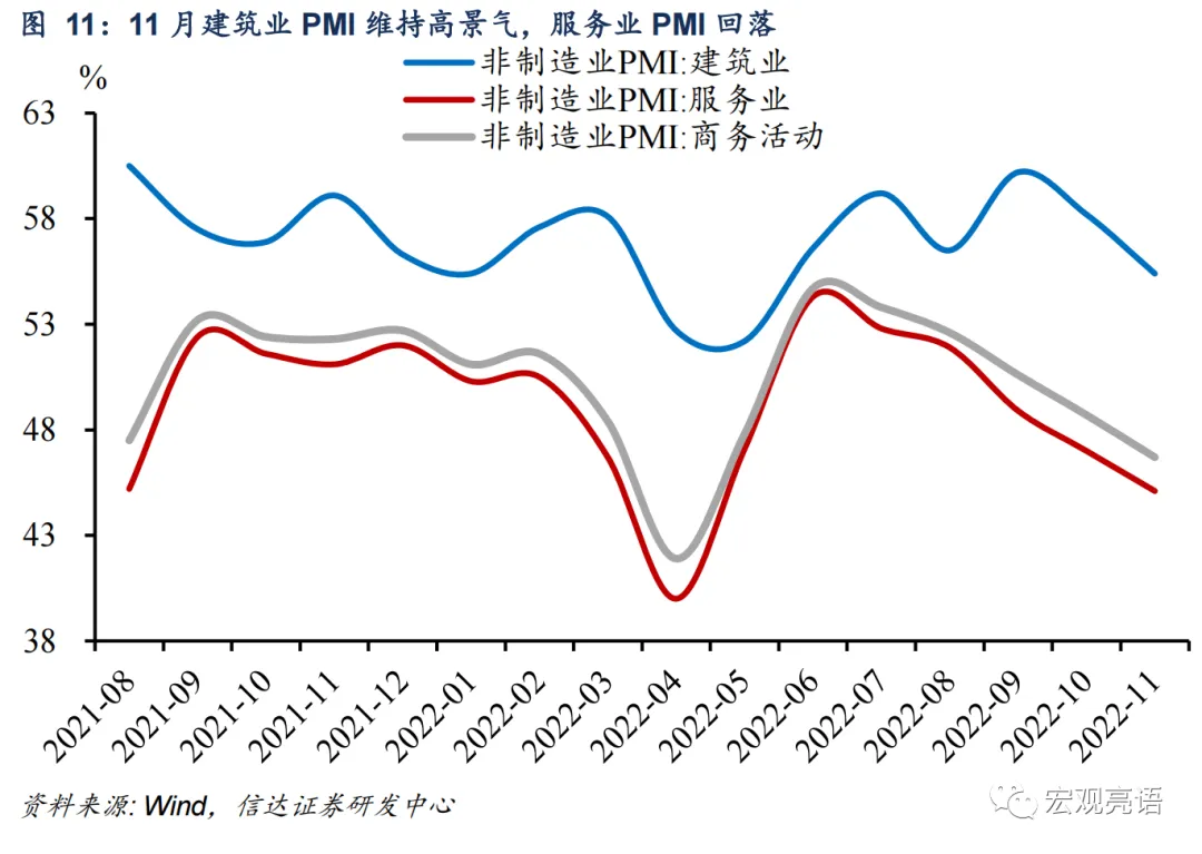 疫情对制造业景气度的扰动边际削弱。11月份疫情反弹与4月相似,但制造业景气度受到的冲击比4月份要小。1)生产和需求端受到的冲击程度不同。二者冲击不同的根源或在于国内疫情严格指数不同,因此对景气度的扰动有所削弱。2)物流不畅导致交付时间滞后不同,库存积累程度也不一样。此外,从经济动能(新订单-产成品库存)来看,4月和11月的经济动能也有着明显差异。从价格端看,11月制造业原材料购进价格扩张且出厂价格收缩,企业利润空间缩小,整体资金压力加大。在市场预期方面,整体上,短期内企业对生产经营活动预期趋于减弱。服务业继续探底,政策支撑建筑业高位运行。在疫情波及面逐步扩大的影响下,11月非制造业供需下行压力进一步加大,非制造业PMI年内仅高于4月份。1)疫情扰动犹存,服务业继续探底。随着疫情波及面的扩大,11月服务业PMI继续下行,但下降幅度不及4月。受疫情反弹影响,北京、广州地铁客运量下跌,道路运输、航空运输、住宿、餐饮、文化体育娱乐等接触性聚集性行业商务活动指数回落。2)基础建设相关活动继续支撑建筑业的高景气水平。四季度以来,新一批重点项目集中开工,在稳投资相关政策支持下,以土木工程建筑为主的基建相关行业保持较快增长,建筑业PMI维持较高景气水平。3)非制造业也存在一些结构性亮点。一是受益于电商购物节的需求拉动,线上消费相关行业保持活跃。二是金融业对实体经济支持力度较好。稳增长政策发力下,四季度疫情冲击可能小于二季度。总体来看,11月PMI重现产需双弱格局,疫情仍是拖累经济的最主要因素。但疫情形势严峻下,11月呈现了与4月不同的景气度表现,其背后释放的边际信号也值得我们关注。一是,后续防疫措施优化有利于弱化疫情对经济的扰动。预计12月疫情对制造业和非制造业景气度的扰动还会继续存在,但随着疫情防控二十条优化措施落地,更精准、更有效地防控疫情,有利于削弱疫情对经济恢复的扰动。二是为确保后续经济运行在稳定回升通道,稳增长政策持续发力的必要性加大。现在基建、制造业和房地产领域的有利政策越来越多,各项政策或将继续落实落细,以稳住经济形势。在稳增长政策发力下,四季度疫情冲击可能小于二季度。