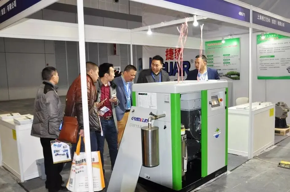 四号馆内,格兰克林压缩机公司的技术总监刘秀明先生正在向客户介绍这次展会上推荐的智慧节能型水润滑无油螺杆空压机,设备正开机运行,刘总监耐心地解答着客户的提问,这款产品操作简便,噪音振动低,而内部的全304不锈钢结构保证了可靠的品质和更长久的寿命。