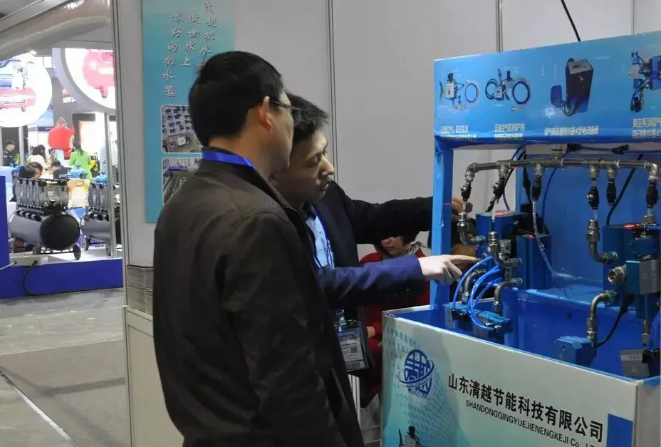 山东清越节能的站台上,一个“流水潺潺”的装置引起观众们的注意。清越节能主要从事零气耗防堵、防冻节能液位控制全自动排水器;气控球阀;螺杆空压机卸载停机等压缩空气系统节能产品的研发生产,这次会上展示的正是新研制的排水器。