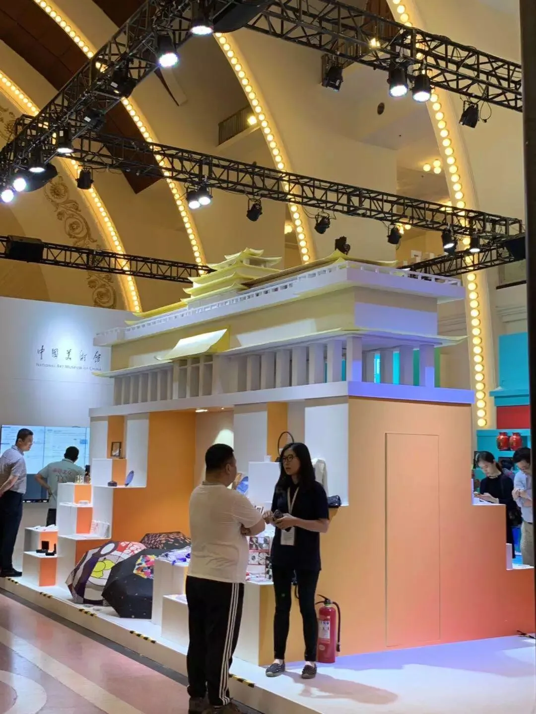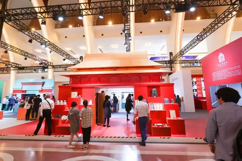 东侧中直院团舞台艺术展区,延续序馆红色调及新中国成立70周年主题,国家京剧院、中国国家话剧院等14家中直院演艺院团的重点优秀剧目,在红色背景板的错落呈现中,给人视觉震撼。而特别值得一提的是首次亮相十二艺节的五家文化和旅游部直属文化文物单位展区。结合北京文化地标高墙、宫门、斗拱、屋檐等建筑元素,为文创产品搭建一个沉浸式的体验空间。
