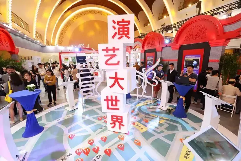 与老北京古建筑风格遥相呼应的,是西侧上海展区以“一大会址”和石库门经典元素打造的海派风格。走进其中,积木错落垒起的“演艺大世界”字样尤为醒目,循环播放的海派音乐与灯光让人仿佛置身童年记忆中五光十色的“大世界”。