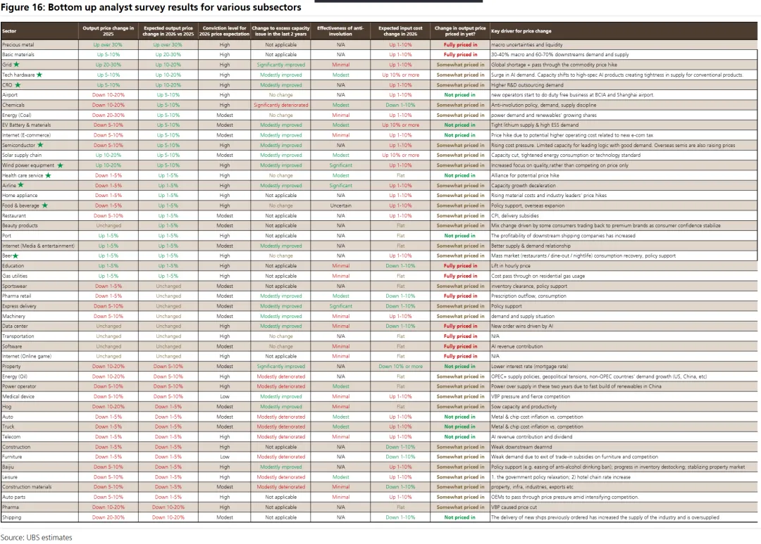 全球大宗商品价格在2025年上涨9%后持续走高,给中国企业带来成本压力。瑞银对行业分析师的自下而上调查显示,与去年相比,更多公司计划在2026年提高产品价格,分析师预计今年平均价格将上涨2%,这与2025年下降3%的情况形成鲜明对比。这一趋势的背后支撑因素包括部分行业过剩产能问题的缓解(54%的分析师认为过去两年有所改善)以及政府对通胀和“反内卷”的日益关注。如果中国确实走向再通胀,瑞银估计MSCI中国指数有20%的上涨潜力,其中16%来自估值重估,3-4%来自更强的每股收益增长。然而,此举也存在风险,如果提价导致销量下降,或企业无法转嫁成本,MSCI中国指数的EBIT(息税前利润)可能会下降约7%。