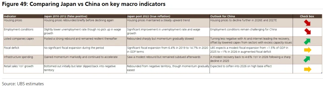 目前中国展现出一些再通胀信号,例如PPI(生产者价格指数)降幅收窄、债券收益率上升以及企业盈利能力改善。尽管如此,与日本在2022年后成功走出通缩的经验相比,中国实现可持续的再通胀仍面临诸多挑战。日本的成功得益于工资通胀、大规模的财政扩张以及后疫情时代社会观念的结构性转变。反观中国,持续的房地产下行周期抑制了通胀预期,而严峻的青年就业问题则对工资增长构成潜在阻力。瑞银认为,当前风险与回报大致均衡,中国能否在今年持续走出通缩,很大程度上将依赖于未来的财政、货币和房地产政策,目前前景尚不明朗。