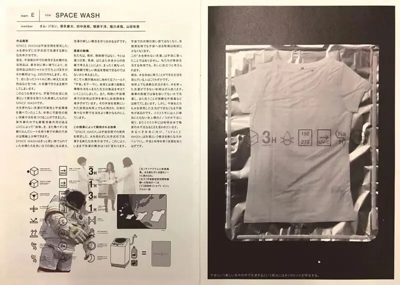 在现在的宇宙中,飞行员的衣服都是用完后直接扔掉,然后在大气层烧尽。每次宇航员要用新的衣服时,需要从地球直接通过火箭发射到太空站,运送每公斤衣服大概需要花费200 万日元(约10 万元人民币),为了节省这笔巨大的开支,也为了让飞行员能在宇宙空间中洗衣服而设计了一款概念性产品,它能通过不用水的方法分解汗和杂质,并利用外面的塑料包装经过紫外线进行杀菌消毒。