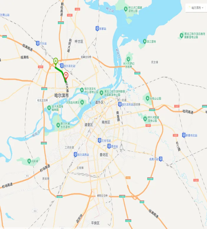 2)出城:松北区松北大道76号(黑龙江省农机大市场)沿松北大道向北行驶4公里,至绥满高速大耿家收费站出城。