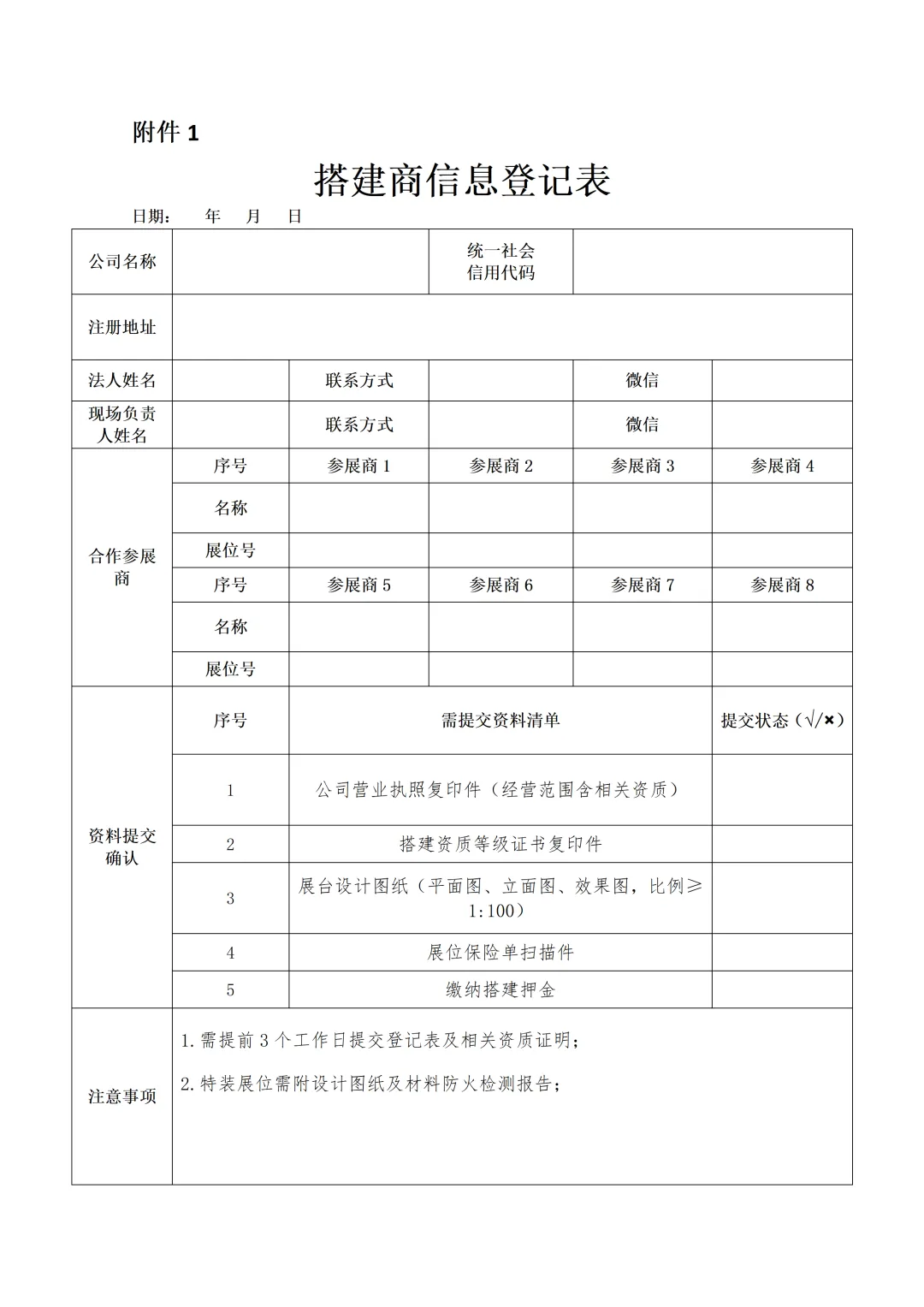2)参展单位需要向组委会提交搭建单位营业执照,保险单以及缴纳搭建押金(详见附件1搭建商信息登记表)。