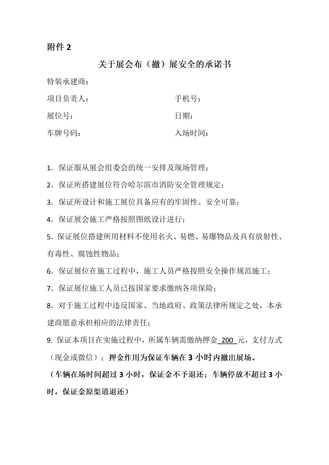 3)特装展位搭建需选用防火、环保材料,符合国家消防安全标准,搭建单位须具备相应资质,签订安全责任书(详见附件2展会布撤展安全承诺书)。
