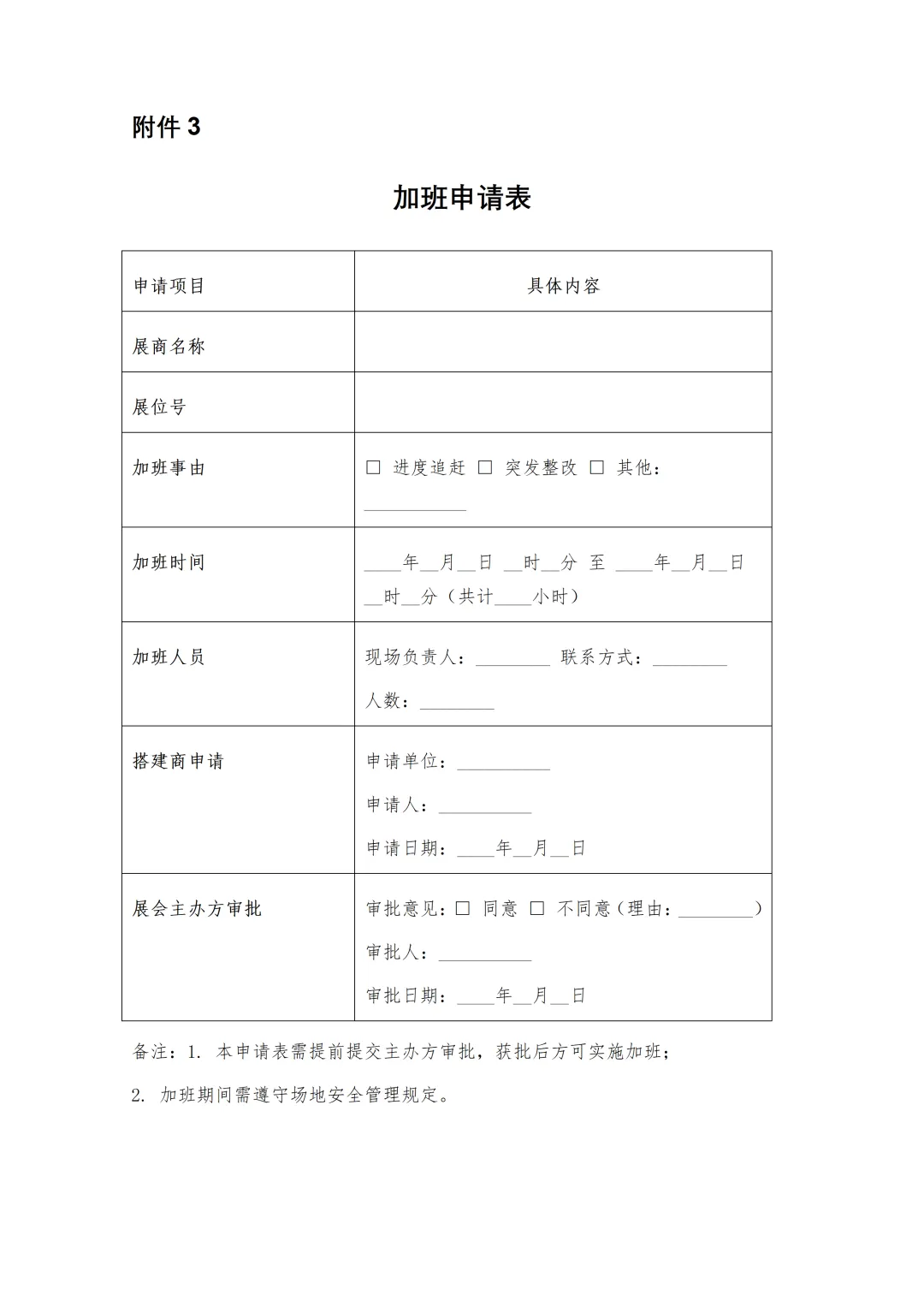布展时间:2026年3月12日—3月13日,每日8:00—17:00,超时布展需向场地管理方提交加班申请(详见附件3)并缴纳加班费,收费标准如下: