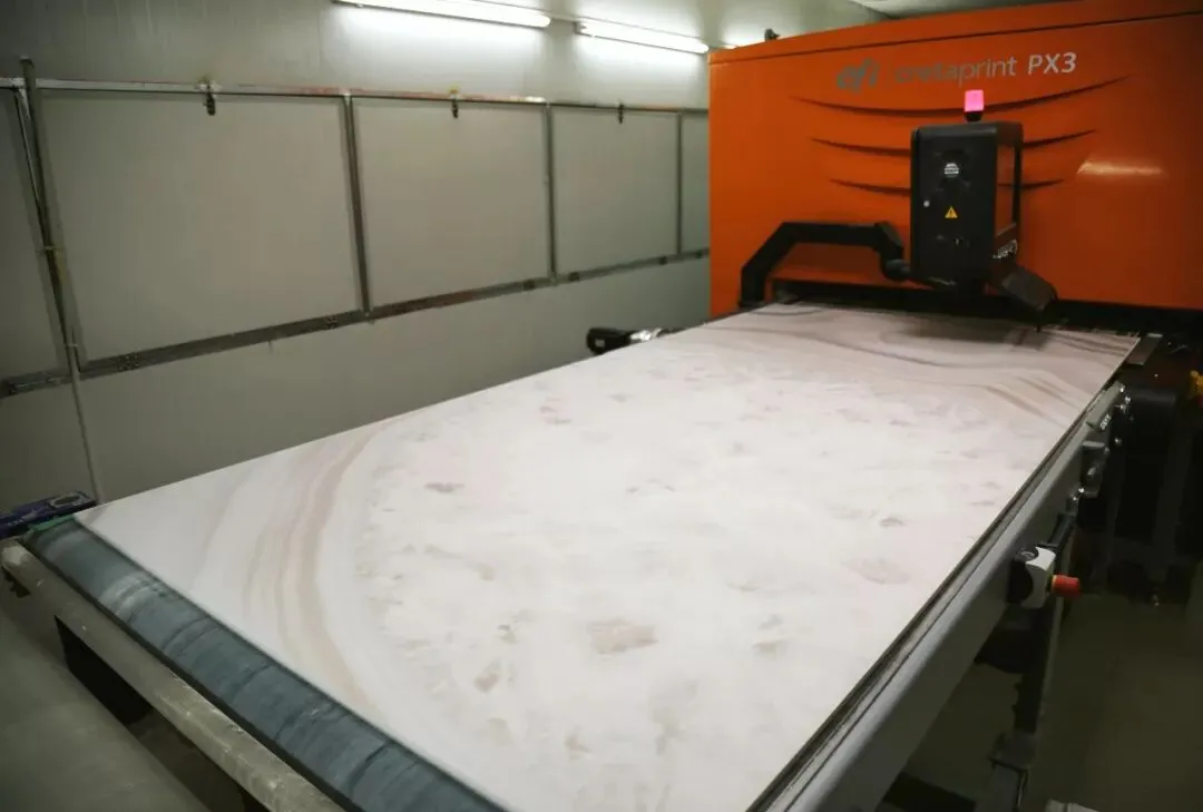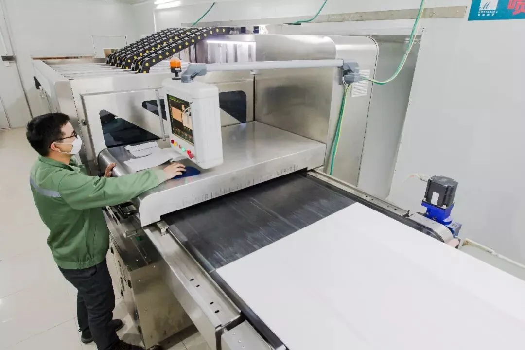 国内先进多通道喷墨打印机,利用数字化喷墨装饰工艺控制系统,实现连续100件产品不重样,颜色花样更精准。