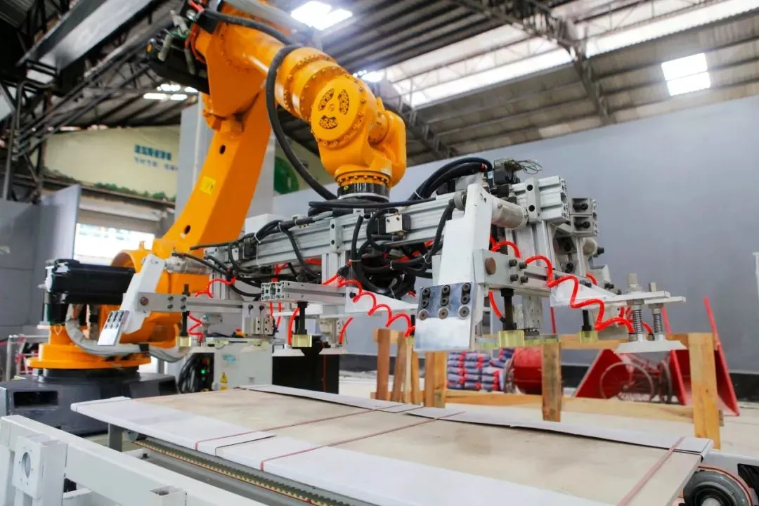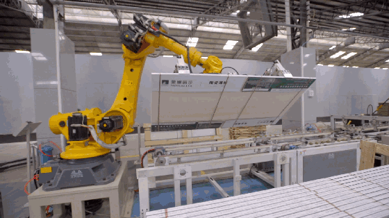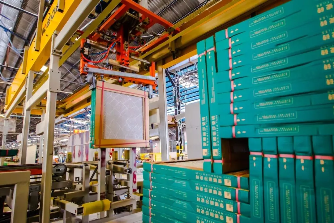 从自动打包线上过来的一箱箱陶瓷薄板,只见机械手灵活地进行定位、抓取,然后猿臂轻舒,提升、旋转,将一箱箱薄板码放的整整齐齐。