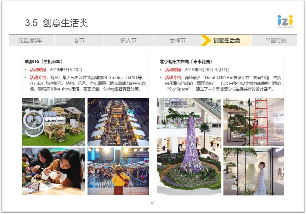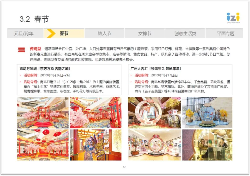商场推广&运营案例分享方面,主要会聚焦在1月的元旦新年、2月的春节、情人节、3月的女神节等几个重点节假日商场绞尽脑汁的营销案例或美陈装置分享: