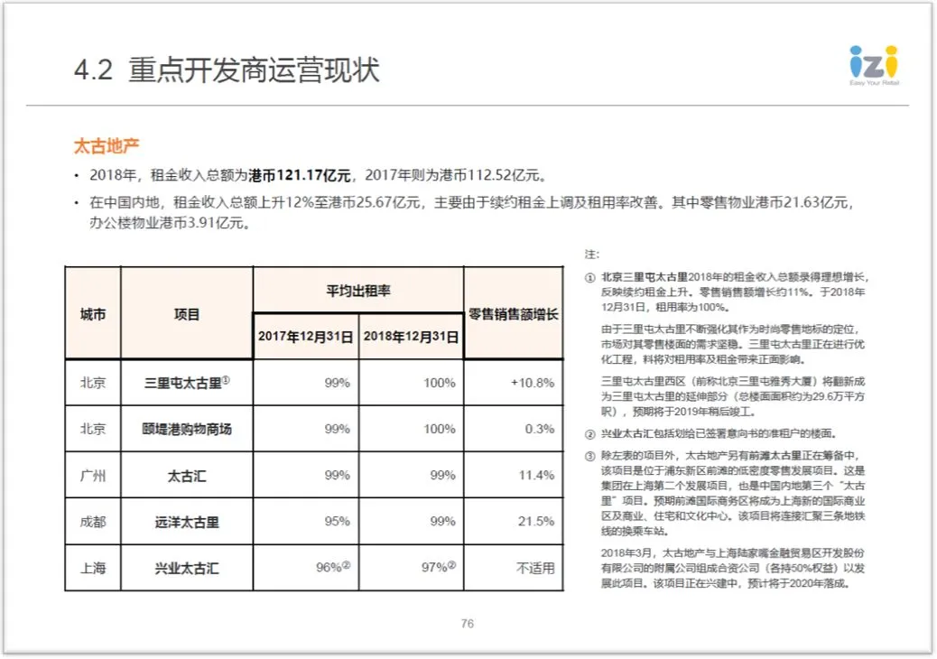 上市企业经营状况分析版块,除了业内相关重大新闻事件外,由于正值年报公布窗口,因此本期会看到类似恒隆、太古、华润、龙湖、嘉里、百盛等各类优质开发商及集团2018年的表现情况: