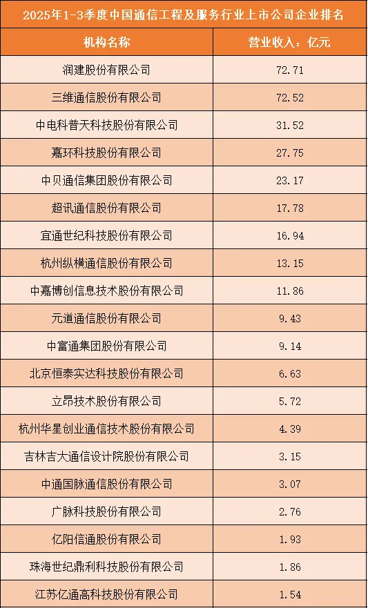 一、2025年1-3季度中国通信工程及服务行业上市公司企业排名分析