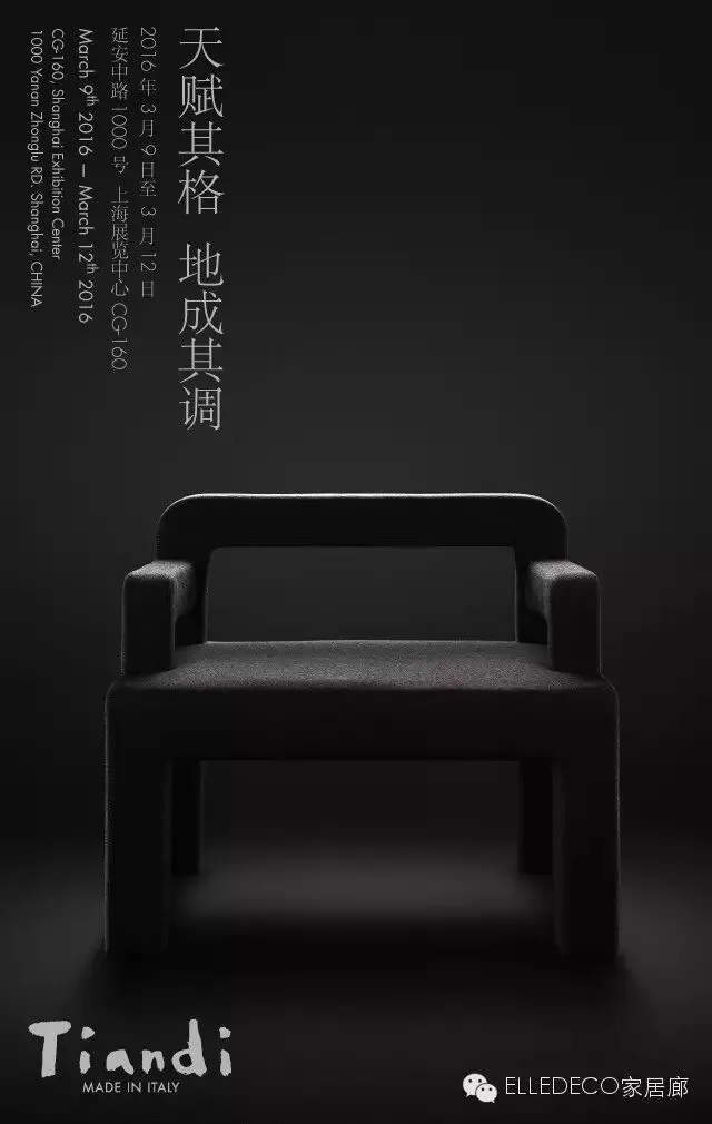 Tiandi,是“家天地Domus Tiandi”旗下的原创家居品牌。Tiandi的造物灵感源于对中国传统文化精粹的提取,运用东方审美与意大利设计之间的声息相通的特性,通过欧洲顶级制造工艺及精湛技艺,来表达对东方生活方式的思考。2015年5月,意大利米兰世博会(EXPO 2015)开幕,Tiandi品牌首次亮相于万科馆(VANKE PAVILION)VIP LOUNGE,并随着万科馆(VANKEPAVILION)成为官方保留建筑而永久留存。此次Tiandi品牌登陆“设计上海2016”,为亚洲站的首次曝光。其所蕴含的“中国设计,欧洲制造”,也成为震撼产业的标志性事件。