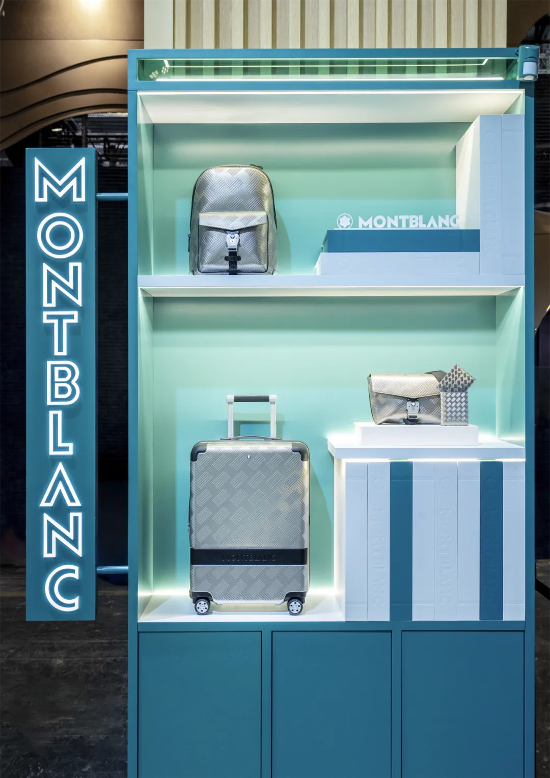 品牌展区以书籍为主视觉元素,采用书架造型装置打造作品陈列空间,巧妙呼应“书林漫旅”主题。展陈空间采用全新风尚3.0系列皮具作品的松石蓝作为主色调,摩登配色令人耳目一新;而该系列作品标志性的压纹印花图案亦被生动地铺陈于整个展厅地面,以新颖设计传达品牌的先锋活力。
