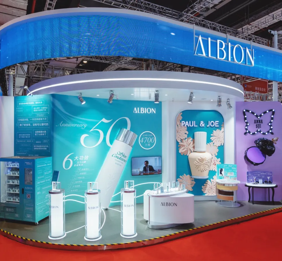 作为殿堂级美妆品牌,ALBION澳尔滨集团第三次亮相展会,展区以清新蓝色的品牌色为主色调,集团旗下三大品牌ALBION、PAUL & JOE和ANNA SUI,以鲜明独特的设计风格开启全新视角,冲击性视觉装置将集团三大品牌的王牌产品——澳尔滨健康水PRO、PAUL & JOE搪瓷隔离以及ANNA SUI蜜粉以灵动又抓人眼球的方式展现在观众面前,澳尔滨集团夺目亮眼的设计为第六届中国国际进口博览会带来更多精彩。