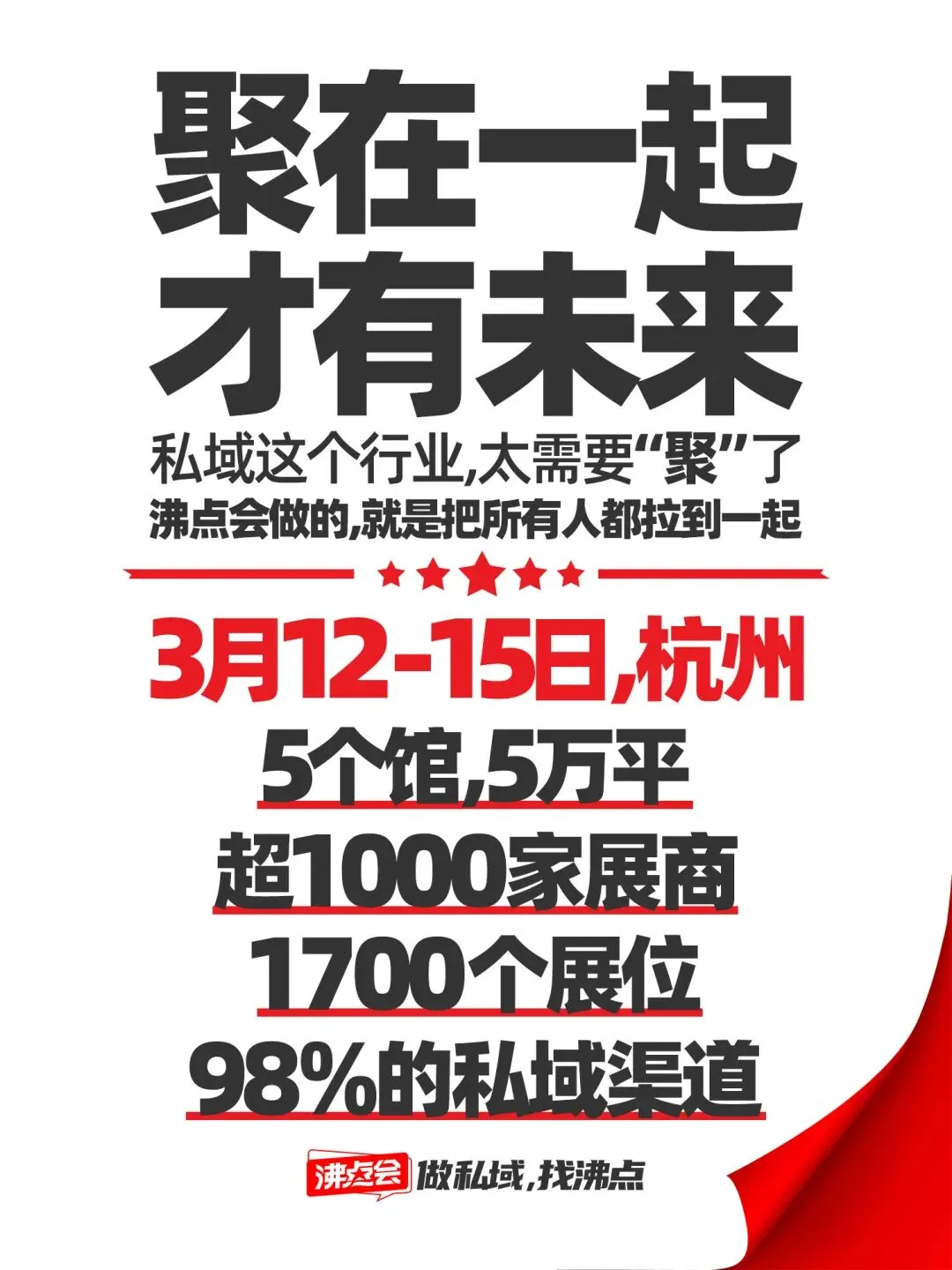 私域这个行业,太需要“聚”了。聚在一起,才有未来。而沸点会就是聚集的“圆心”——5个馆,5万平,超1000家展商,1700个展位,98%的私域渠道。