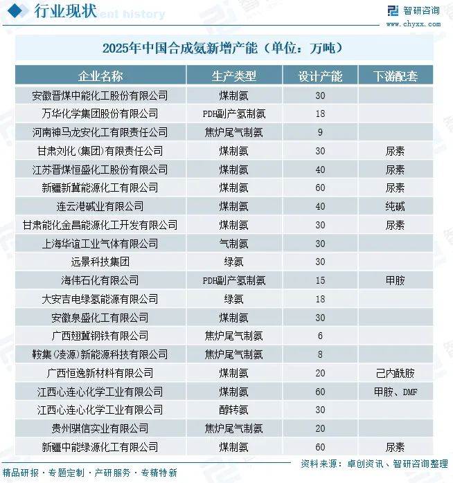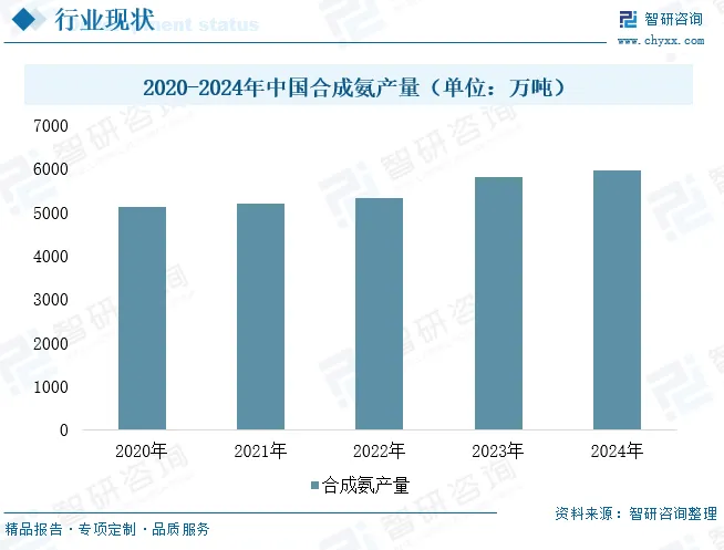 合成氨作为农业化肥、工业化工领域的核心基础原料,我国合成氨行业发展已相当成熟。自1973年正式具备自主建造大型合成氨成套装置能力后,行业进入高速发展期,2015年起受市场供需变化影响出现产能过剩问题;经国家供给侧改革调控,至2021年基本完成有序产能规划,行业发展逐步回归理性。截至2024年我国合成氨产量达5954.2万吨,整体产能产量稳步提升,预计2025年全国合成氨整体产能将达到8247万吨,产能增速持续加快,其中绿氨将成为新增产能中的核心增长力量。