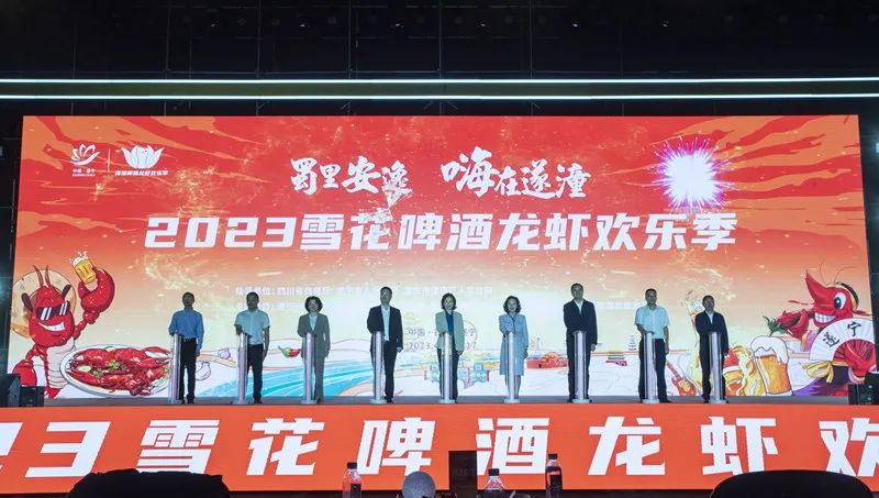 出席开幕式的领导共同按亮灯柱,正式启动“蜀里安逸·嗨在遂潼”2023雪花啤酒龙虾欢乐季活动。