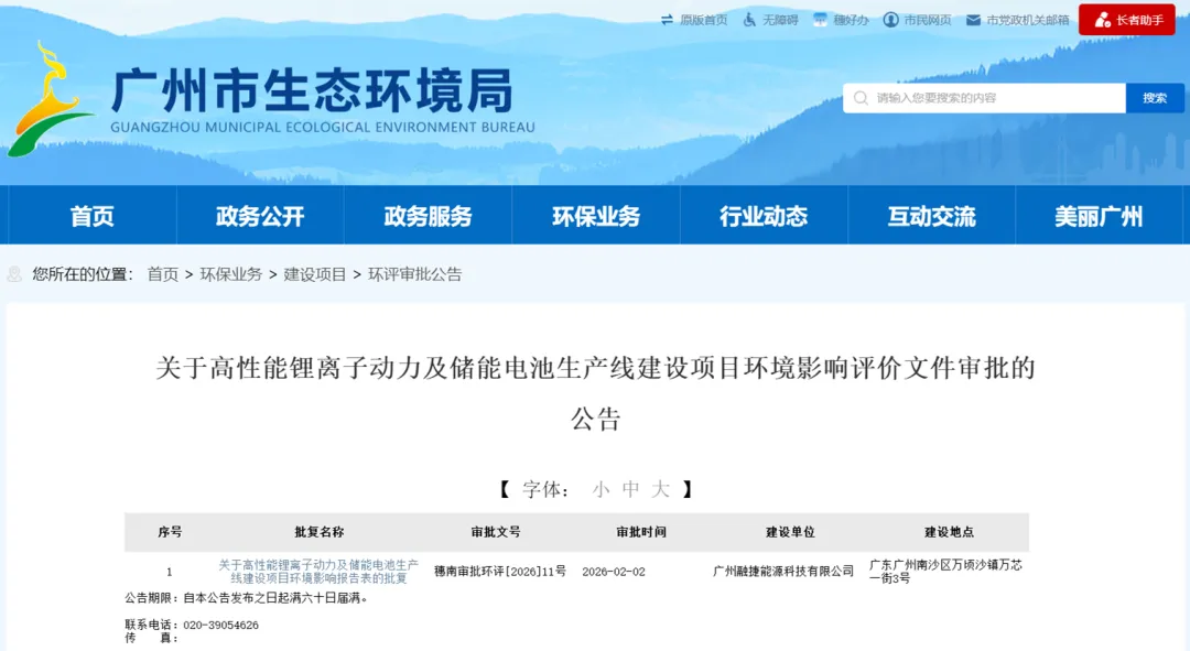 2026年2月10日,广州市生态环境局官网发布《关于高性能锂离子动力及储能电池生产线建设项目环境影响评价文件审批的公告》。
