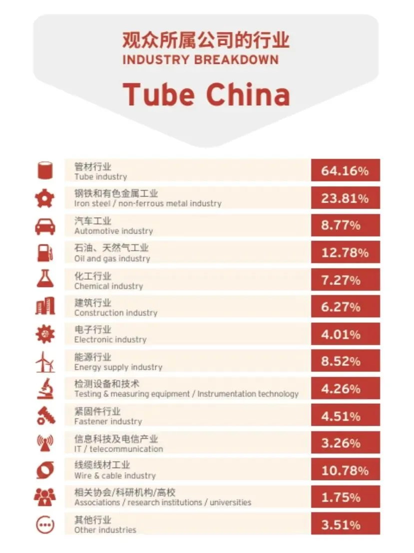 历经20年的积淀,Tube China不仅成为了亚洲领先的管材、管道行业展览会,也是行业的先驱者。主办方杜塞尔多夫展览(上海)有限公司和中国国际贸易促进委员会冶金行业分会将发挥各自优势,推进管材制造技术创新、节能环保、绿色化和智能化转型,提供全新升级的贸易交流平台,聚焦行业热点,以专业的视角呈现行业最新的产品、可交易技术及解决方案。
