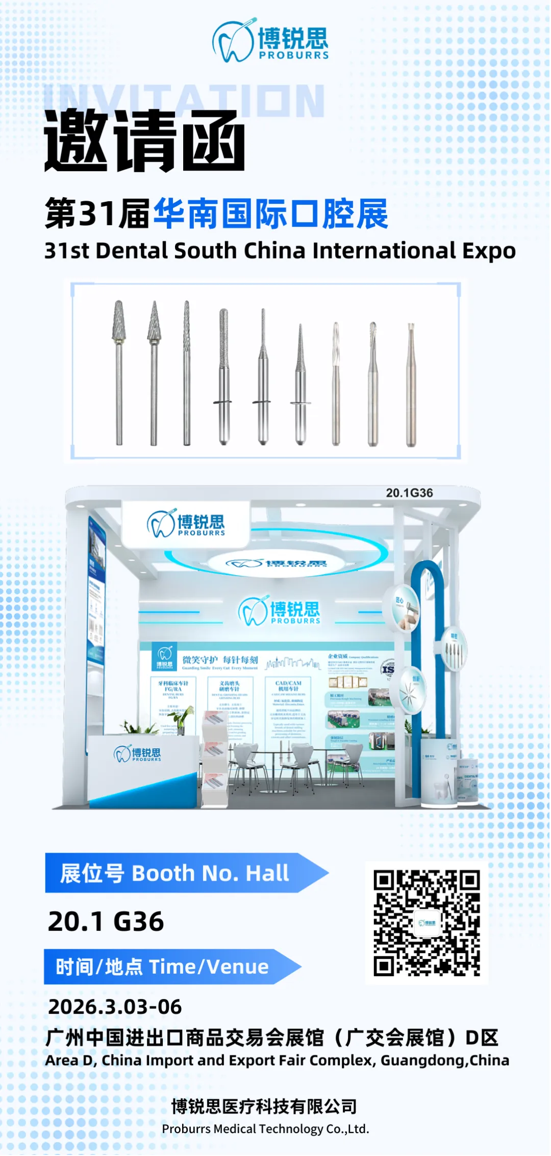Spring is full of vitality, and all things are renewed. As the annual trendsetter of the dental industry, the 2026 South China International Dental Exhibition is about to open in Guangzhou. Proburrs Medical Technology Co., Ltd. sincerely invites every industry colleague and partner to visit our booth 20.1 G36. We will showcase the latest dental medical technologies and innovative solutions, and explore new opportunities in the industry with you.