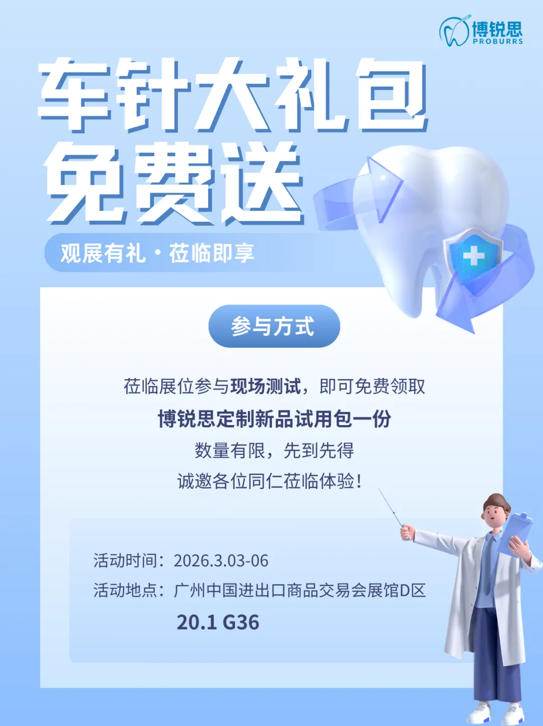 During the exhibition, we have set up a dedicated clinical performance testing area for tungsten steel burs at Hall 20.1, G36. We sincerely invite all doctors to try it out on-site and experience the cutting feel, stability, and chip removal performance of Proburs tungsten steel burs on materials of different hardness. Let the data speak, and let personal experience testify.