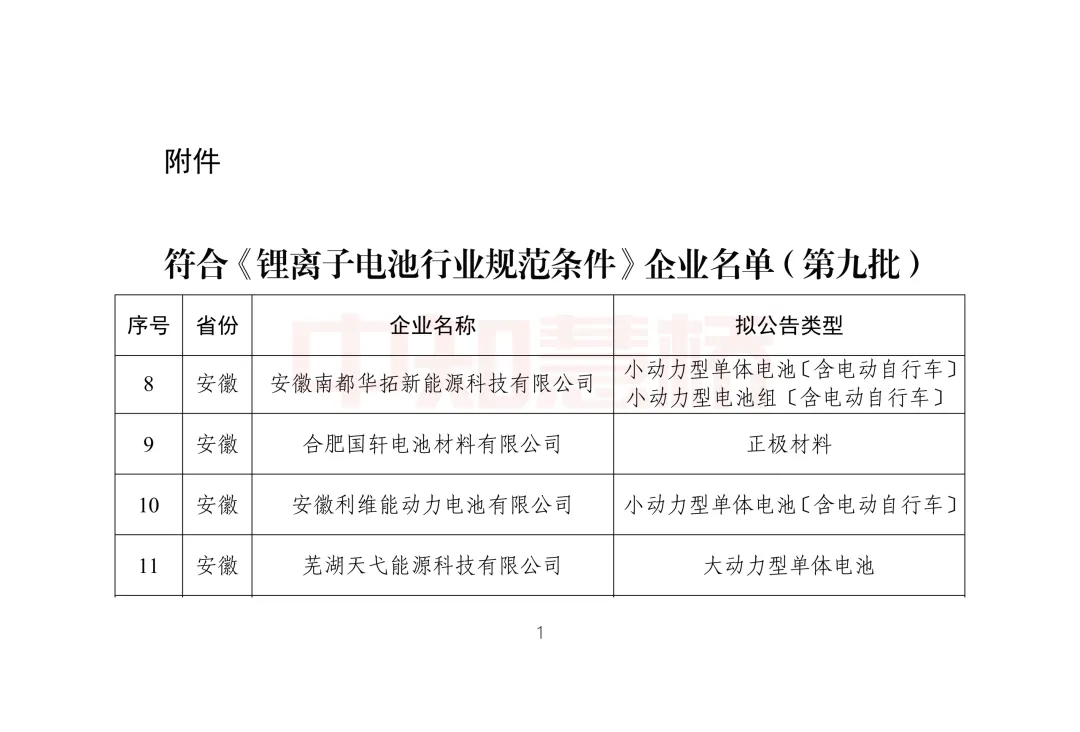 依据《锂离子电池行业规范条件(2024年本)》《锂离子电池行业规范公告管理办法(2024年本)》,经企业申报、省级工业和信息化主管部门推荐、专家复核、现场核实、网上公示等环节,现将符合《锂离子电池行业规范条件》企业名单(第九批)予以公告。