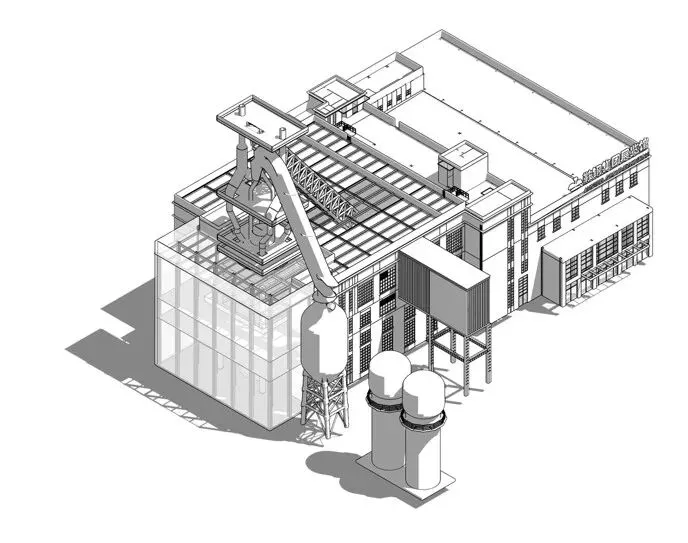 整个展览既体现了新旧元素的碰撞,也成为工业气质与建筑艺术的珠联璧合。以高炉展示区为例,原本的设计方案中,炼铁一号高炉为整体移建并进行露天安置展出。由于高炉移建后二者的地基沉降不同,为实现原有方案效果,设计团队决定在高炉与烧结机厂房的结合部使用玻璃幕墙景观造型,延续旧有造型特征,兼顾密封和防雨。设计师在为炼铁一号高炉等工业遗存提供一定保护的同时,以现代的方式诠释工业建筑的风格,从而呈现出与原建筑形成强烈对比的设计效果。