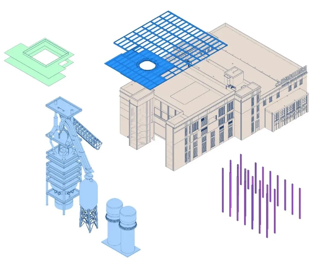 设计团队从工业景观设计和工业展览设计两个角度出发,抽出鞍钢文化的精髓。在对建筑厂房进行改造时,拆除厂房西侧部分无法修缮的空间,并在整体拆分70余米高的“古董高炉”——炼铁一号高炉后,将其移至此处重新组装,两座工业遗产合璧。这样既实现了对文物高炉的保护,也让高炉与厂房、与老工业设备共同重构成博物馆最重要的工业遗产景观。