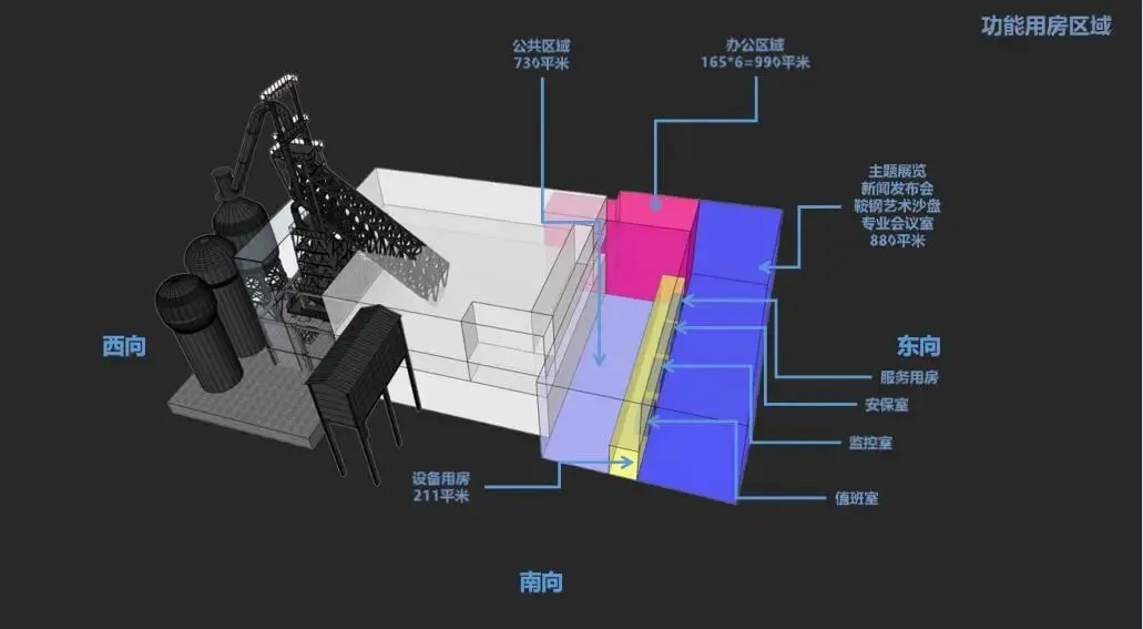 “改造体设计”,展现鞍钢故事。设计团队以现有工业遗产为基础,保留其基础外形,修缮其原有功能来实现展览的功能需要,例如在“古董高炉”与烧结机厂房的结合部,使用玻璃幕墙景观造型延续旧有造型特征,从而达到保护古董高炉的目的;在不破坏其外形的基础上附加新的功能以适应展览的多种需求,例如通过修缮复原烧结厂房南面的大型货运电梯,使其承担起展品货运功能。这些设计使得博物馆总体上既保留了老鞍钢的历史沉淀,又开拓了新鞍钢的文化符号。