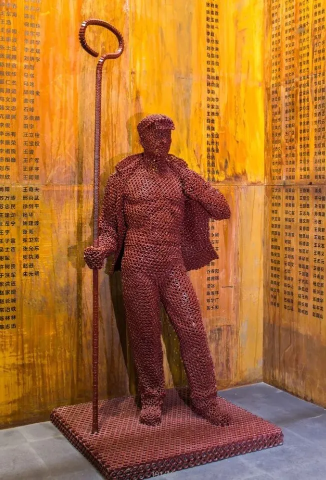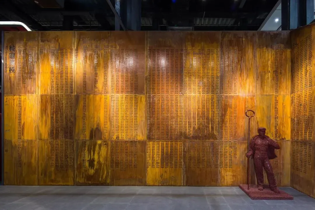 △“英模鞍钢”展厅内的“英模”装置艺术设计灵感来自于鞍钢设备库内大量的构件和配件,万千螺母造型寓意着千千万万的鞍钢人集聚合力,凝聚成钢铁般的英雄模范代表。