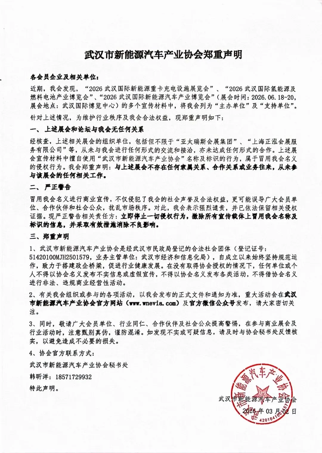近期,我会发现“2026武汉国际新能源重卡充电设施展览会”、“2026武汉国际氢能源及燃料电池产业博览会”及“2026武汉国际新能源汽车产业博览会”在未经授权的情况下,擅自将“武汉市新能源汽车产业协会”列为主办及支持单位。此行为严重侵犯我会合法权益,误导行业公众。为以正视听,现发布郑重声明如下,敬请广大会员及相关单位注意甄别。