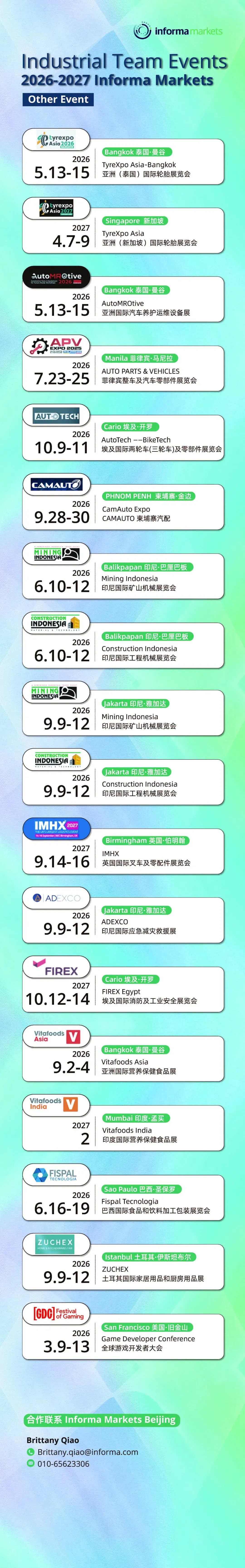 Informa Markets致力于为全球专业市场搭建高效连接、推动创新与成长的平台。我们通过聚焦交易的品牌展会、精准定制的数字内容,以及数据驱动的高价值潜客开发方案,为全球市场参与者提供面对面交流、深度互动与达成合作的多元机会。我们的业务覆盖超过二十个行业领域,包括航空航天、现金制造、医药健康、时尚、基础设施等,讲遍布全球的买家与卖家紧密相连。作为一家国际化的市场构建者,Informa Markets持续激发专业市场的活力,全年无间断释放商业机遇,助理行业繁荣发展。