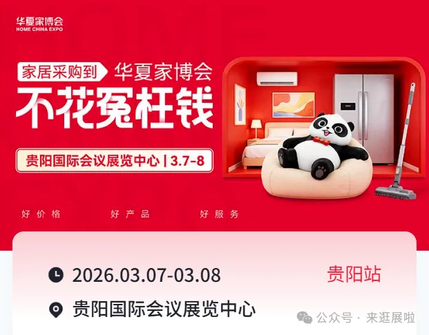 2026年春季贵阳华夏家博会时间将于3月7日-8日地点在贵阳国际会议展览中心举办,本届2026贵阳家博会现场将汇集本地家居建材一线品牌厂商,涵盖:家装设计、家具软装、卫浴陶瓷、地板门窗、橱柜厨电、油漆涂料、灯饰吊顶、壁纸家饰、水暖五金、装修公司等所有房屋装修所需。贵阳装修家博会助力装修市民轻松完成装修采购!
