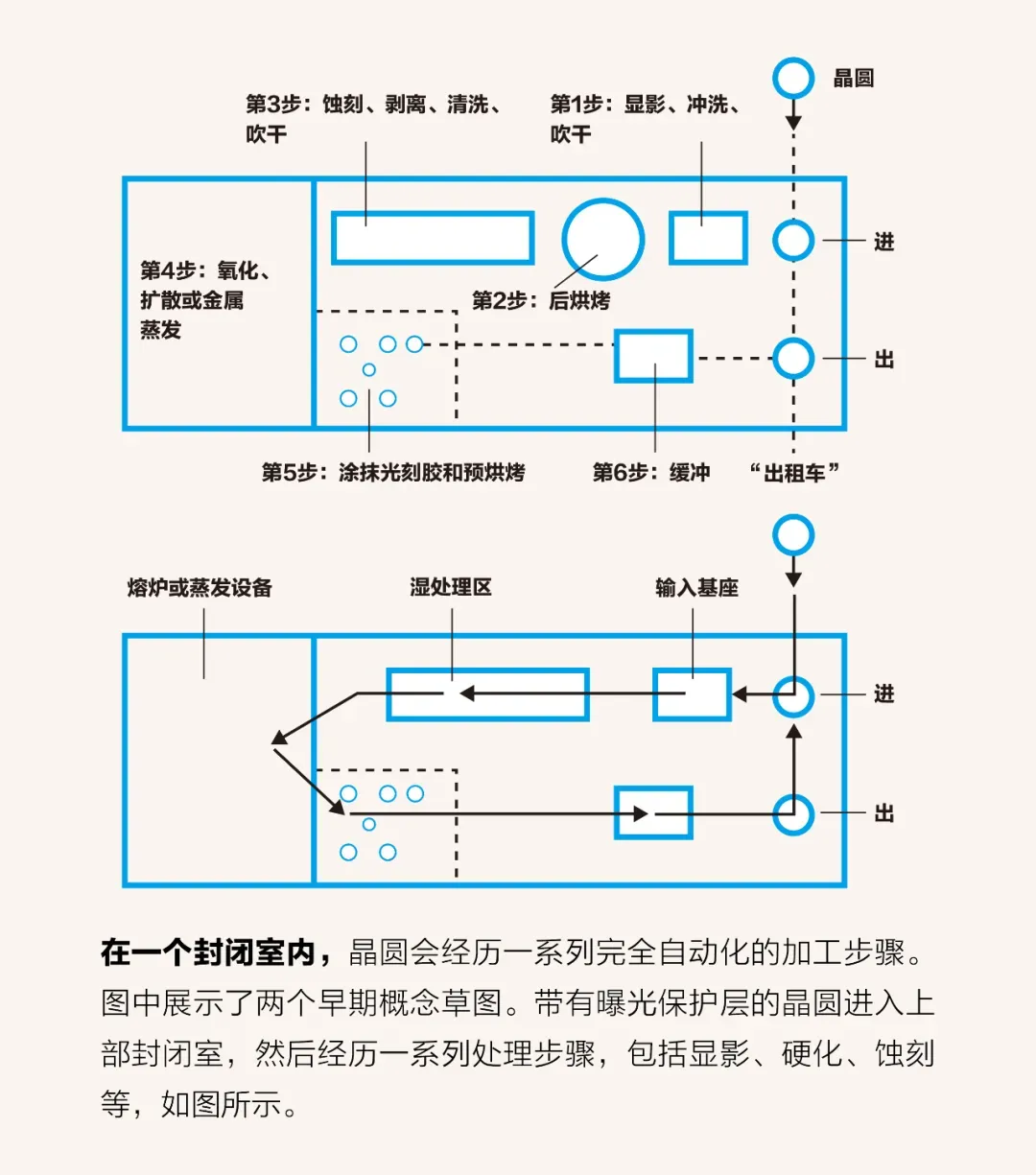 这5个区域中的每一个区域都可被设想为一个封闭空间,其中包含完成工序链中的每个环节所需的所有自动化晶圆加工和处理设备。这些封闭区域及“出租车”系统将为晶圆提供洁净室级别的局部环境。在每个封闭区域内,晶圆通常会从湿化学舱进入微型炉,再到光刻胶应用舱,最后到达“出租车”上车点。例如,晶圆将在湿化学舱中经历清洗、光刻胶显影与光刻胶去除,以及蚀刻等步骤。