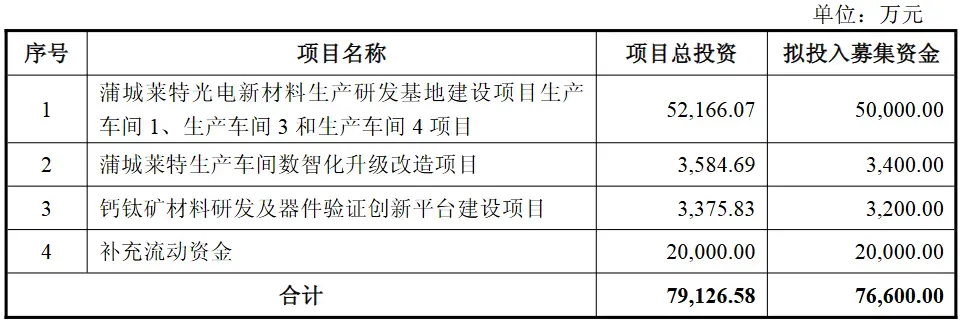 其中,蒲城莱特光电新材料生产研发基地建设项目生产车间1、生产车间3和生产车间4项目总投资额为52,166.07万元,拟使用募集资金额为50,000.00万元,在陕西省渭南市蒲城县高新技术产业开发区计划新建生产车间及其配套的辅助工程和服务设施,用于 OLED中间体、OLED升华前材料、医药中间体和钙钛矿材料等产品的研发与生产。项目建设周期为3年,实施主体为公司全资子公司蒲城莱特光电新材料有限公司,项目建成后,将显著提升公司上述相关产品产能,夯实OLED有机材料全产业链优势,同时拓展医药中间体与钙钛矿材料赛道,为公司业务增长与市场地位巩固提供坚实支撑。
