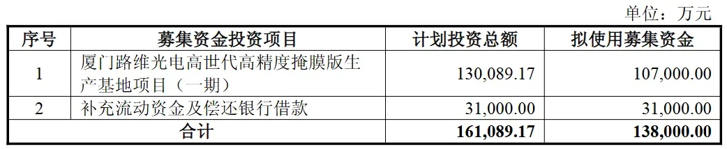 2026年1月21日晚间,路维光电发布公告,拟定增募资不超13.8亿元,用于厦门路维光电高世代高精度掩膜版生产基地项目(一期)、补充流动资金及偿还银行借款。