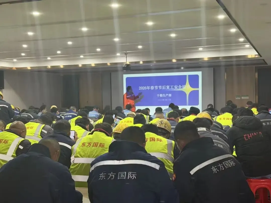 丙午新春,开工号角吹响。干箱生产部按照寰宇启东关于2026年春节节后复工复产安全工作要求,进行收假收心教育。主要目的是让返岗员工尽快从节日的氛围中走出来,调整状态,收拢思想,把心思从“过年模式”切换到“工作模式”,迅速进入工作角色,形成一种“起步即冲刺、开局即决战”的浓厚安全氛围。