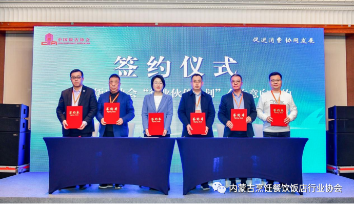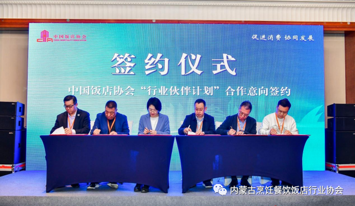中国饭店协会作为全国住宿餐饮行业的国家级协会,积极整合全国资源,通过政府服务、标准制定、平台打造、项目开发等方式,构建产业生态圈,加快推进行业绿色化、数字化、品牌化、特色化高质量发展。经会前定点调研,为进一步共享平台资源,推动重大项目落地。会上还举行了中国饭店协会与内蒙古烹饪餐饮饭店行业协会等多家行业协会“行业伙伴计划”合作意向签约仪式。