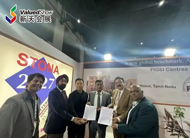 展会期间,最令人振奋的时刻,莫过于新天会展与STONA展会主办方正式签署协议——新天会展,正式获授2027年印度班加罗尔国际石材展(STONA 2027)中国区总代理权!