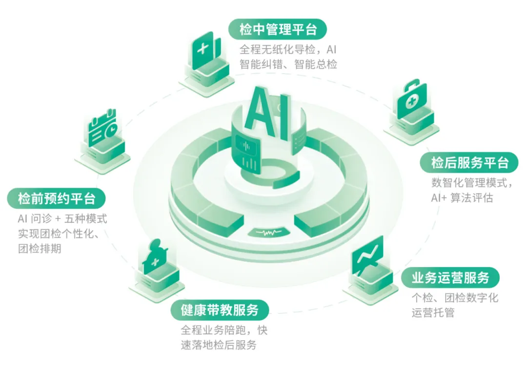 构建AI驱动的“系统+服务”一体化解决方案,提供检前AI问诊与团检个性化、检中智能导检与数据实时质控、检后数智化管理与评估,并提供健康带教陪跑服务和业务运营托管服务。