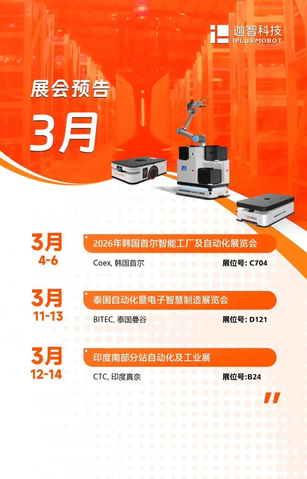 本月,迦智科技将出征韩、泰、印三国工业大展!诚邀您现场见证以智能机器人技术赋能全球生产生活变革。