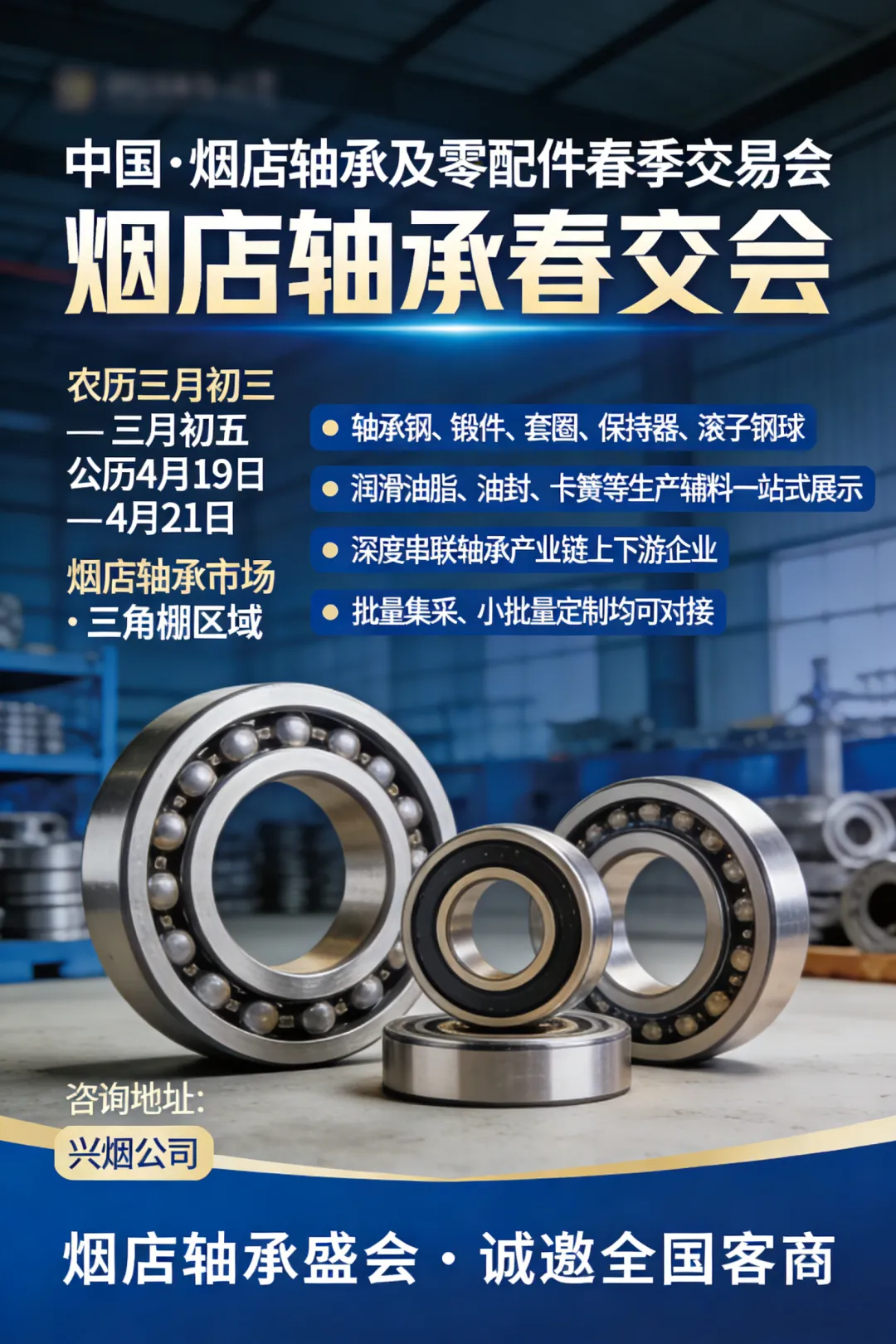 为全面激发轴承产业链上下游活力,进一步破解供需信息不对称、合作渠道不畅通等问题,深化区域产业协同,我市将联合相关单位,举办中国(烟店)轴承及零配件春季交易会(简称“烟店轴承春交会”)。活动方案初步制定如下: