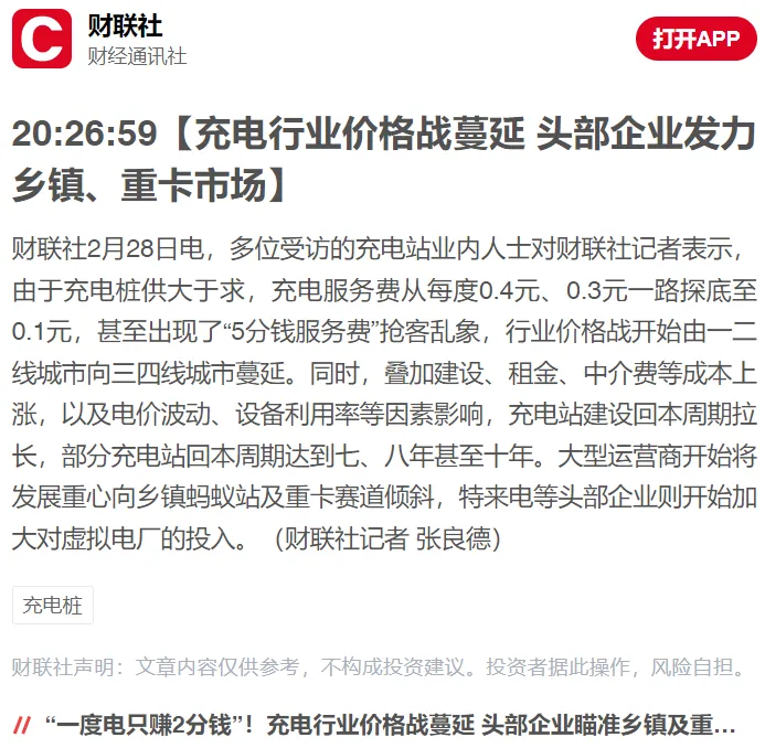 多位受访的充电站业内人士对财联社记者表示,由于充电桩供大于求,充电服务费从每度0.4元、0.3元一路探底至0.1元,甚至出现了“5分钱服务费”抢客乱象,行业价格战开始由一二线城市向三四线城市蔓延。同时,叠加建设、租金、中介费等成本上涨,以及电价波动、设备利用率等因素影响,充电站建设回本周期拉长,部分充电站回本周期达到七、八年甚至十年。大型运营商开始将发展重心向乡镇蚂蚁站及重卡赛道倾斜,特来电等头部企业则开始加大对虚拟电厂的投入。(财联社记者 张良德)