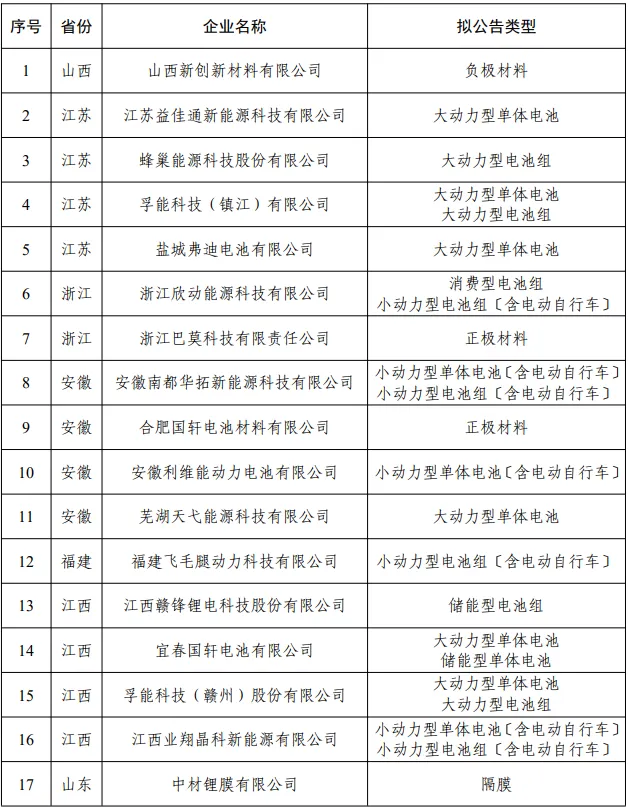 依据《锂离子电池行业规范条件(2024年本)》《锂离子电池行业规范公告管理办法(2024年本)》,经企业申报、省级工业和信息化主管部门推荐、专家复核、现场核实、网上公示等环节,现将符合《锂离子电池行业规范条件》企业名单(第九批)予以公告。