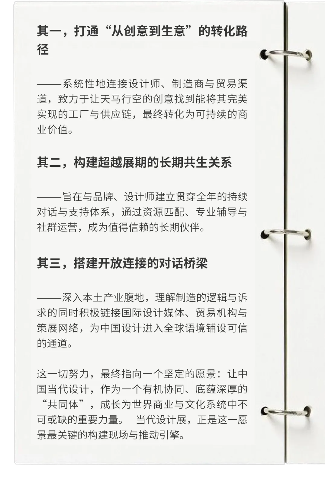基于五年的实践与观察,当代设计展所聚焦的核心议题也愈加清晰:如何将个体的创造性潜能,转化为产业系统性的可持续优势? 这指向一系列需要共同构筑的框架:更加清晰的国际化路径,更加高效的产业链协同,更加开放的新生代设计师的成长通道。而连接创意与商业的桥梁,亟需更坚实可靠的系统支持。基于以上深刻洞察,当代设计展不断突破传统展会作为“静态陈列”的局限,致力于成为一块滋养过程的土壤,一个以 “设计共同体” 为核心理念、从“产业”“价值”“信念”三个方向构建的、旨在破解结构性难题,令创意顺畅流动的生态系统。