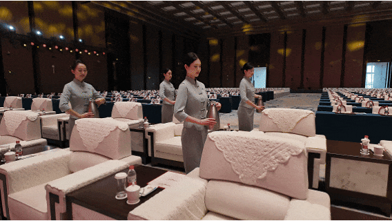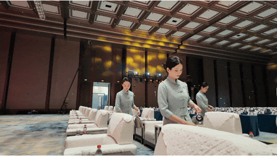 大会当天,团队以饱满的精神状态投入实战:从嘉宾抵达时的微笑引导,到主会场内的茶水服务;从中央船厅的展区协调,到南沙厅春茗的细致保障——各区域人员配合默契,迎宾、会务、餐饮、安保、工程等板块高效协同。安保团队构筑立体化安全体系,工程团队全程驻守保障视听效果,国宾服务团队以规范礼仪展现专业风采。正是这种“事前充分沟通、事中高效协同”的作战机制,让千人大会运行实现“零差错”,让每一位来宾都能感受到细节处的用心。